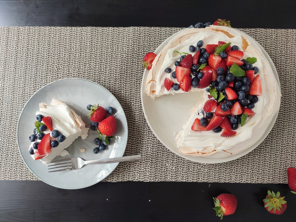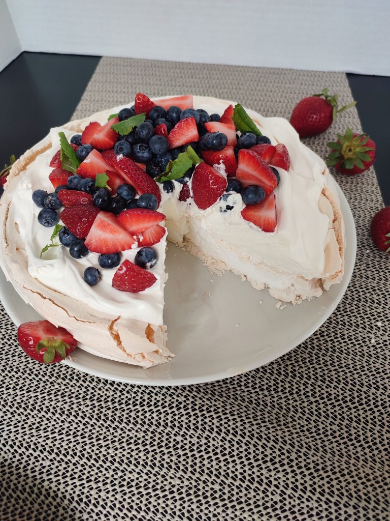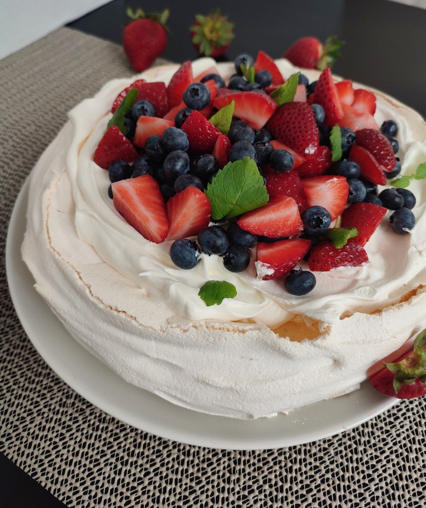 When ready to serve, carefully remove the cooled meringue from the parchment paper and place it on a serving plate. Top the meringue with the whipped cream and arrange the fresh fruit on top. Garnish with mint leaves. Serve immediately to enjoy the perfect balance of sweet, tangy, and creamy flavors.
