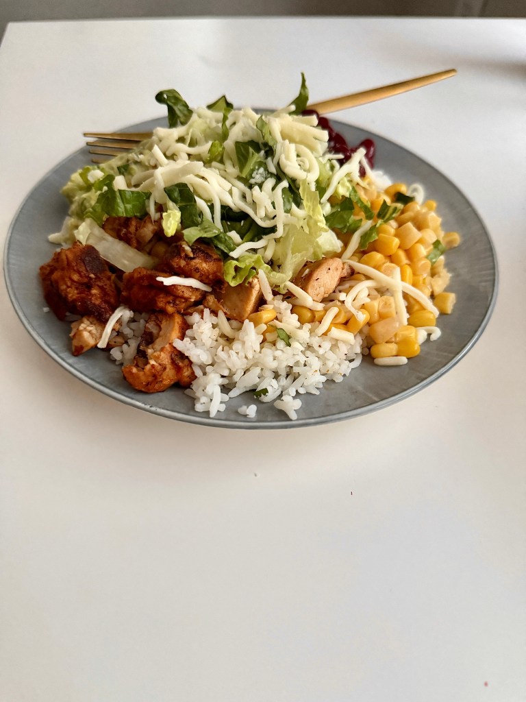 - Assemble the Bowl: In a serving bowl, layer the cilantro rice as the base. Add the sliced chicken, corn, red beans, and chopped lettuce. Top with fresh guacamole.