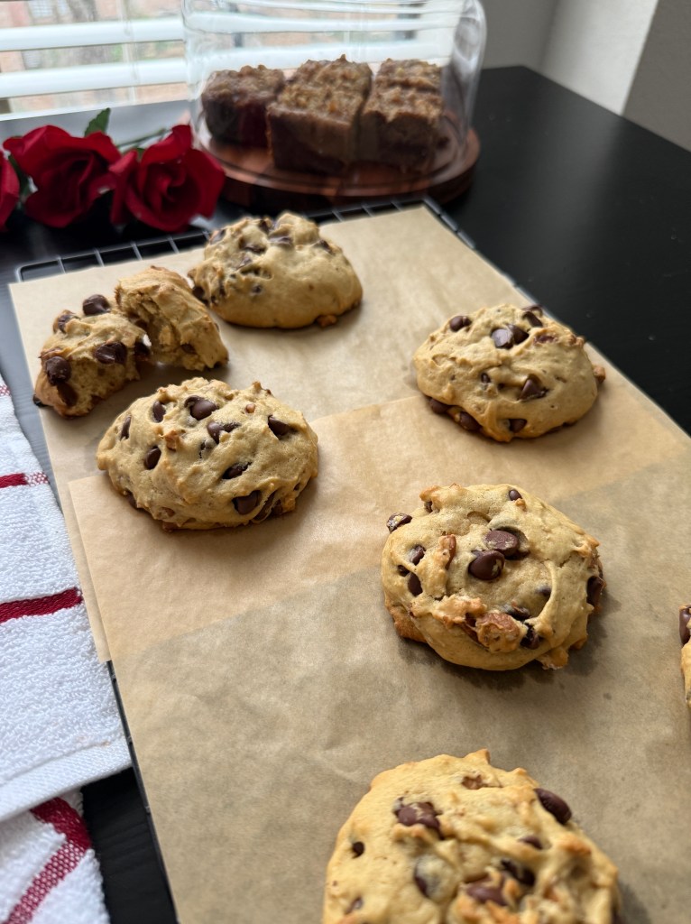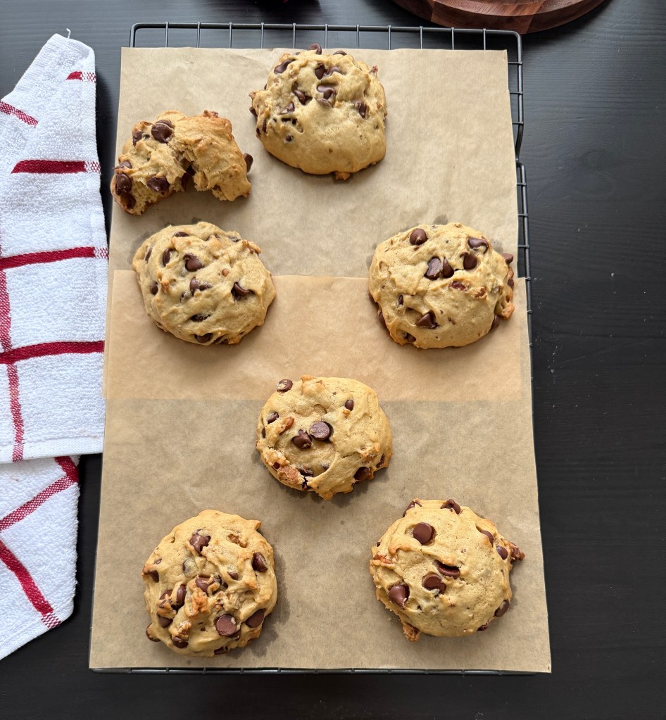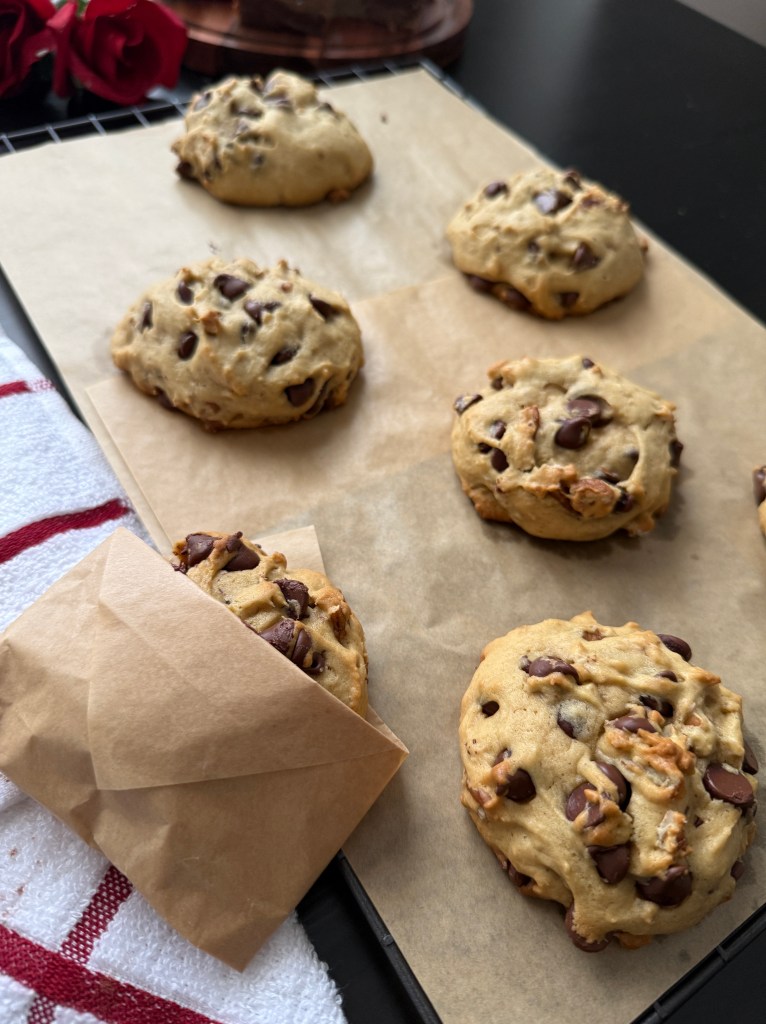 - Scoop 2 tablespoon-sized balls of dough onto the prepared baking sheet, spacing them 4 inches apart. Add extra chocolate chips and walnuts on top.