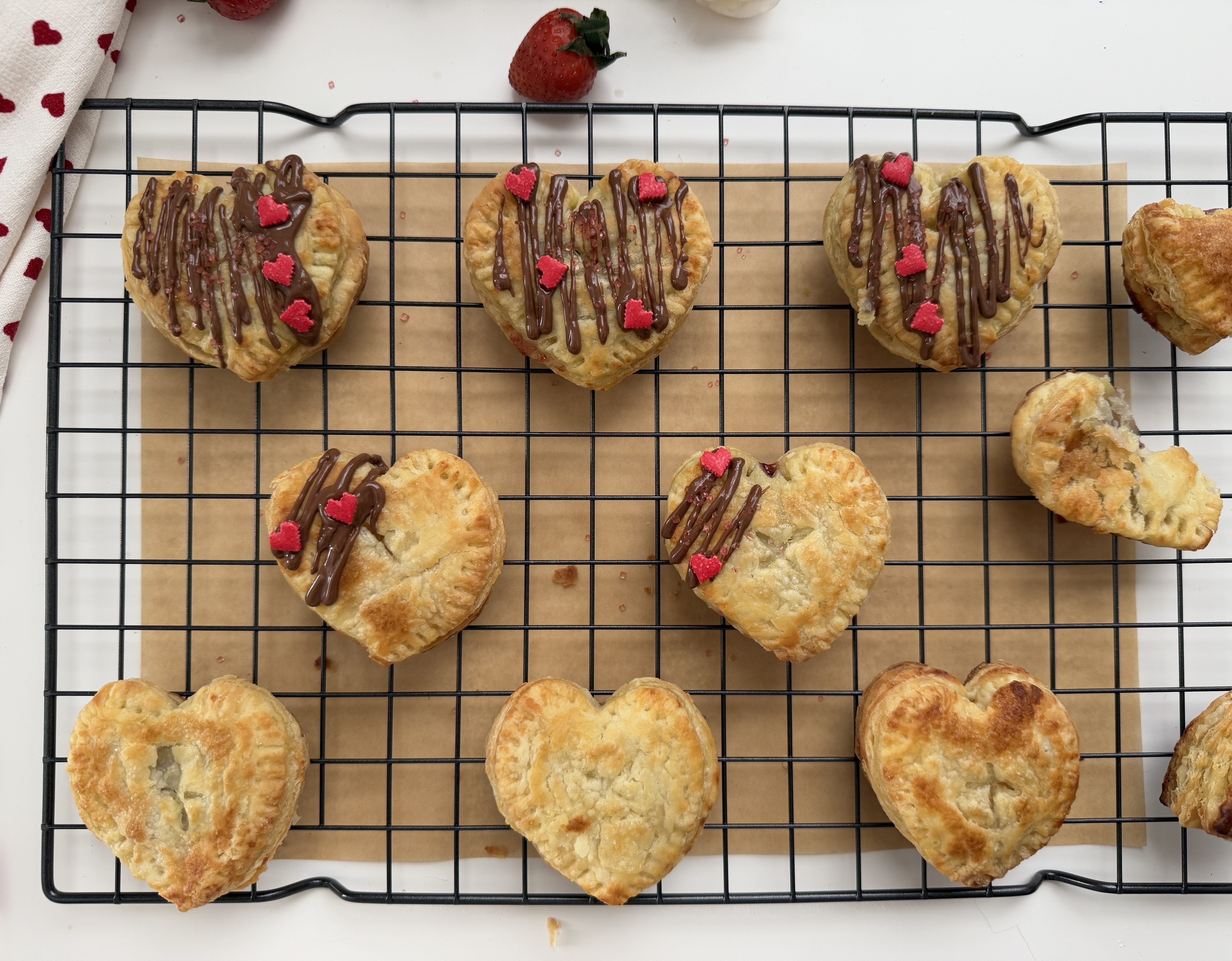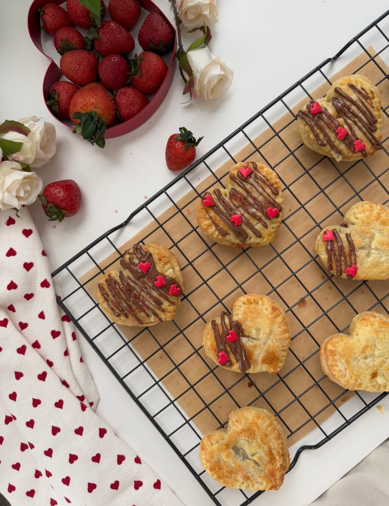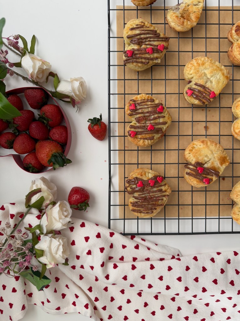 - Roll out the puff pastry and cut out heart shapes using a cookie cutter.