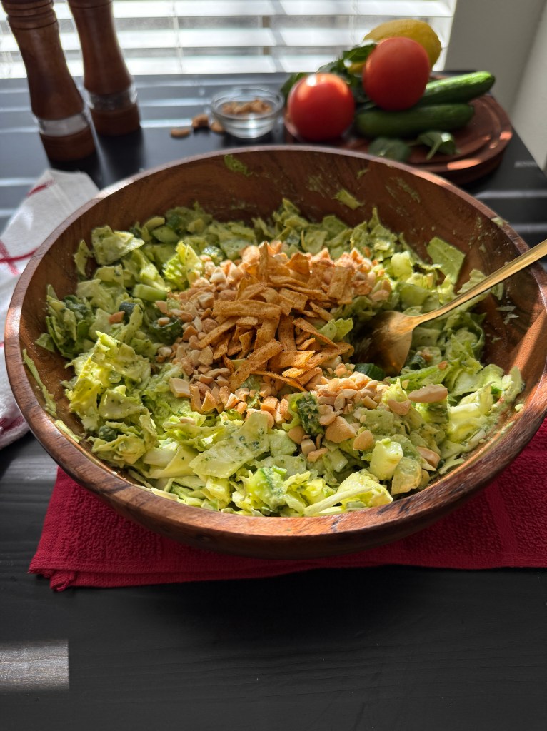 - In a large bowl, add the chopped lettuce, cabbage, diced cucumber, and green onion.