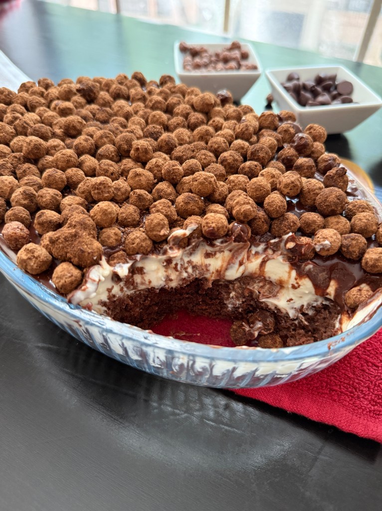 Using a skewer or fork, poke holes all over the surface. Pour 1 cup of chocolate milk evenly over the cake to soak.