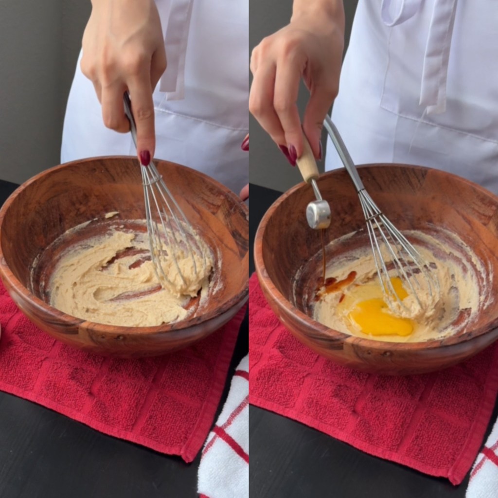 - In a large bowl, beat butter and both sugars with an electric mixer until light and creamy.