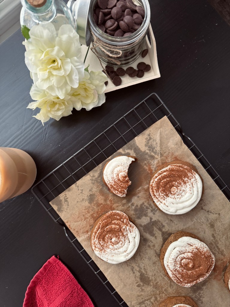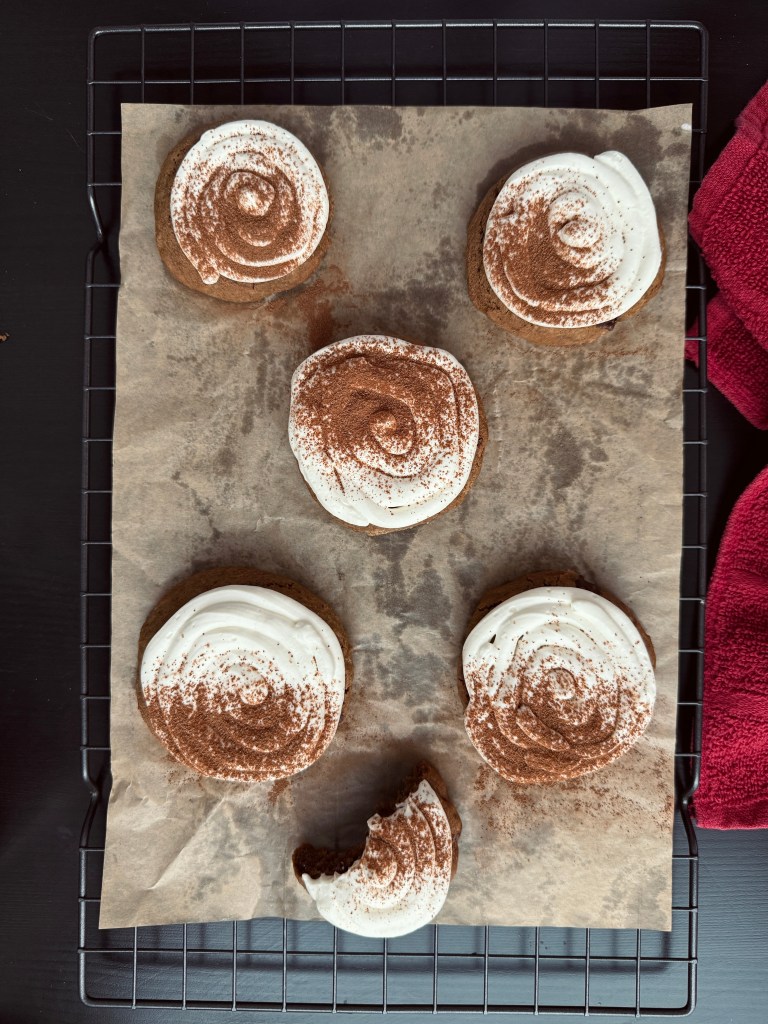 - Once cookies are fully cooled, top each with a swirl of mascarpone frosting using a spoon or piping bag.