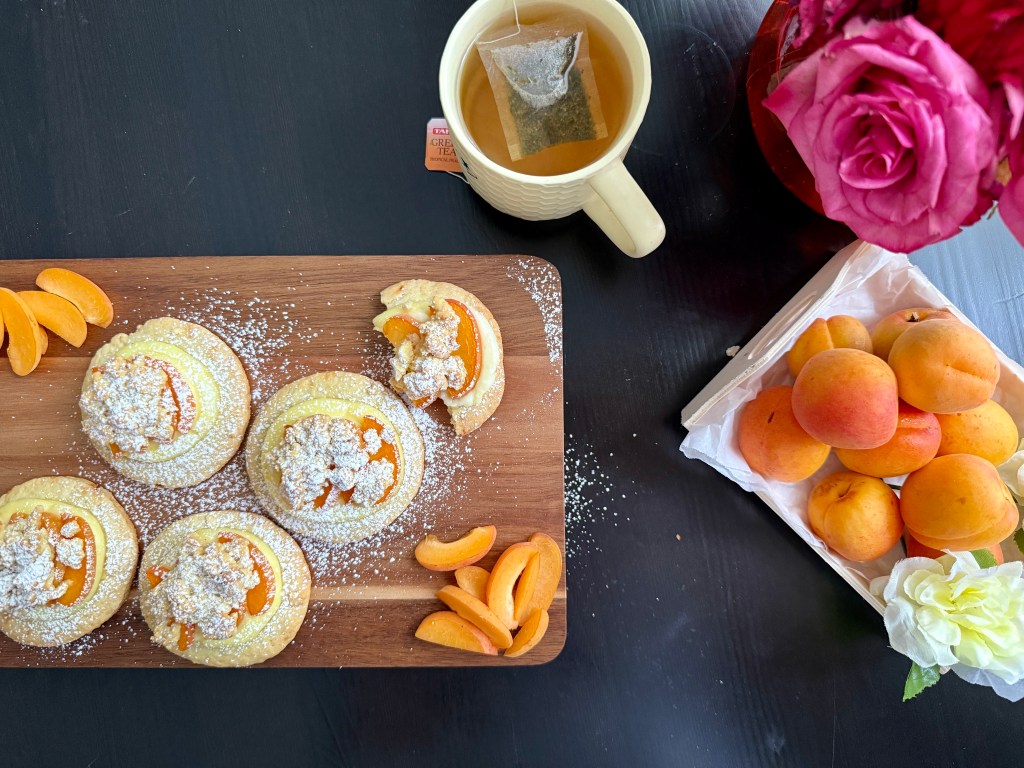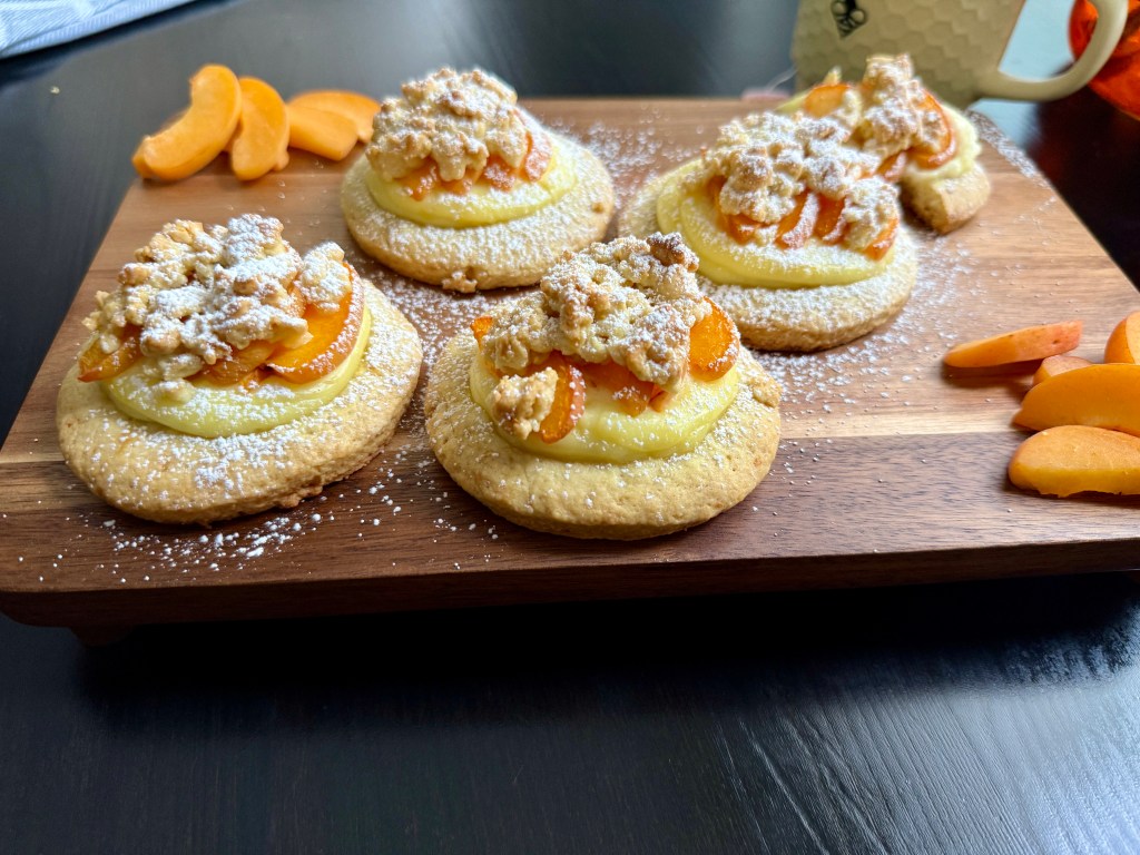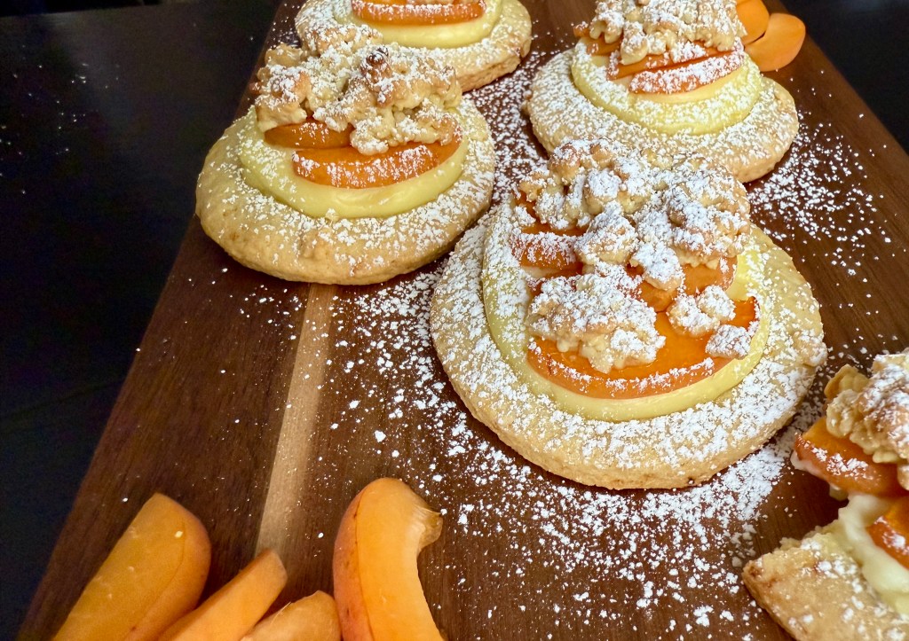 - Assemble the Cookies: Roll out the remaining dough between two sheets of parchment paper. Cut into circles using a cookie cutter. Place the circles on a parchment-lined baking tray. Pipe the cooled cream onto the center of each cookie. Top with a slice or two of apricot.