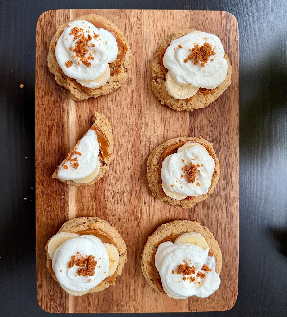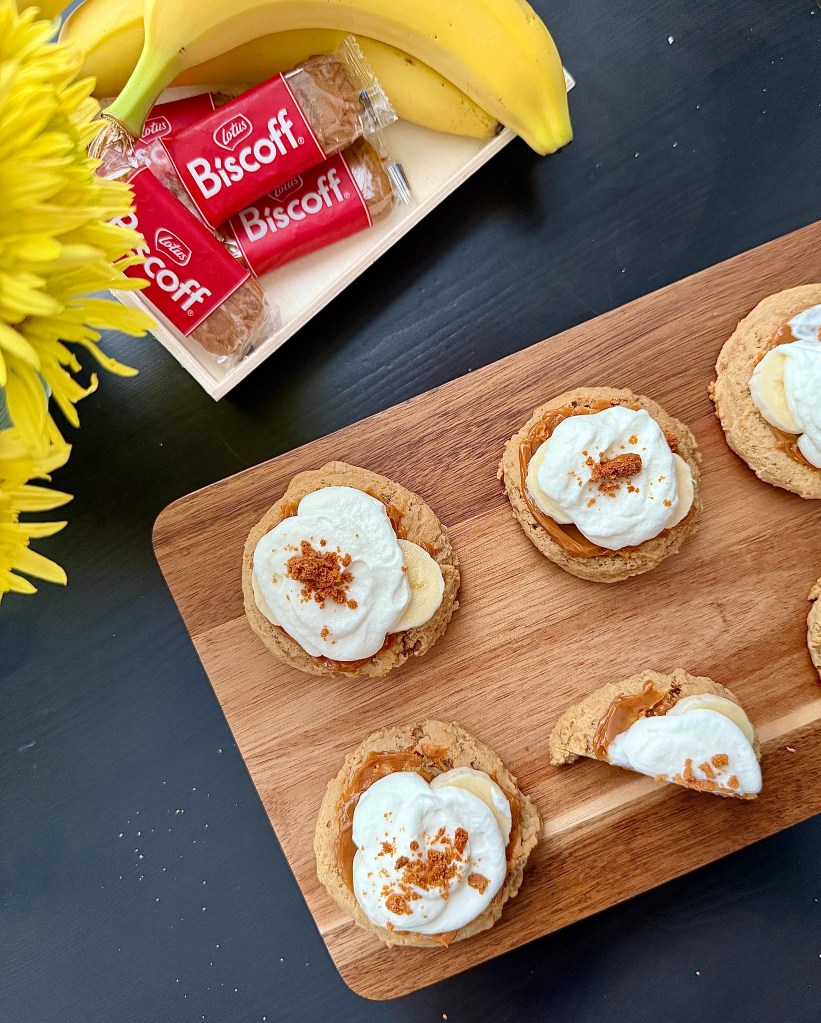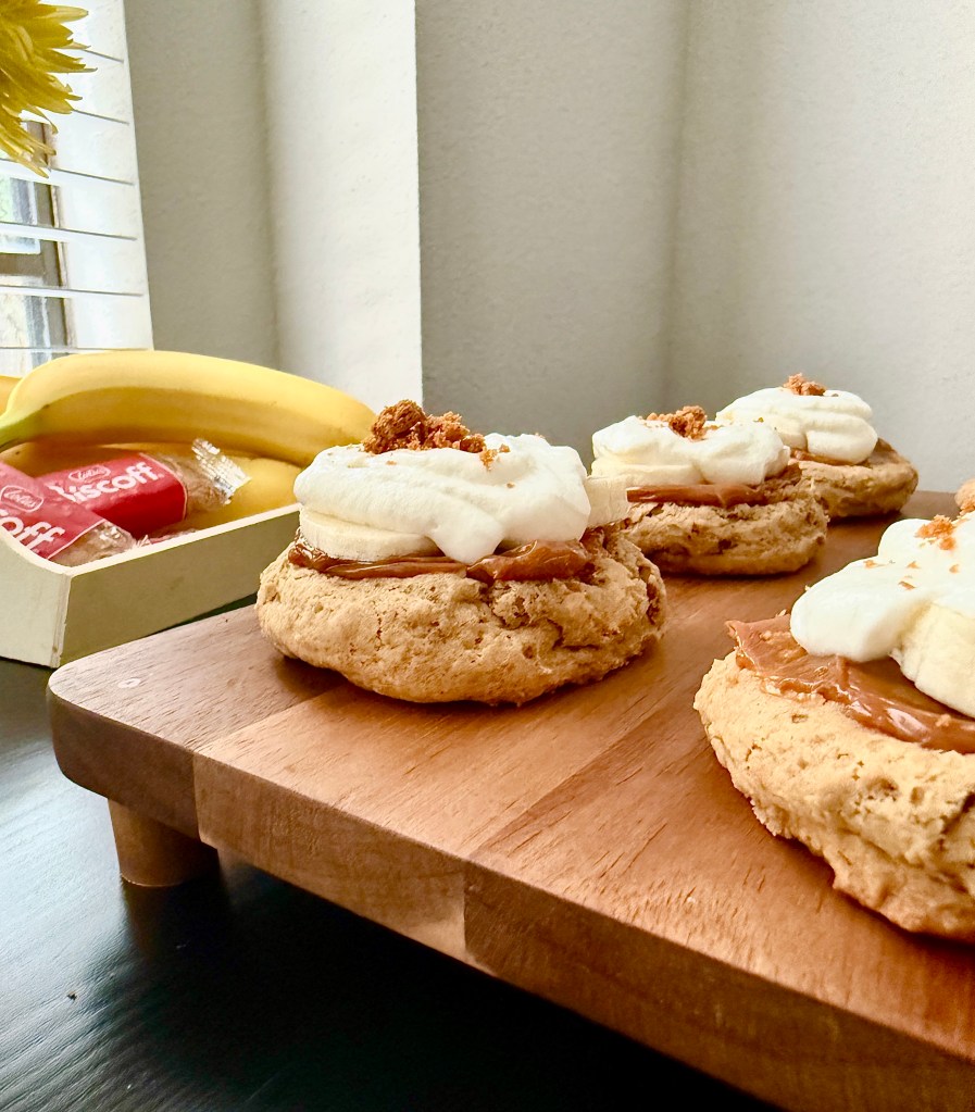 Soft, caramelized banana cookies topped with whipped cream, dulce de leche, and fresh banana slices. Inspired by the classic banoffee pie, these cookies are a handheld dream dessert.