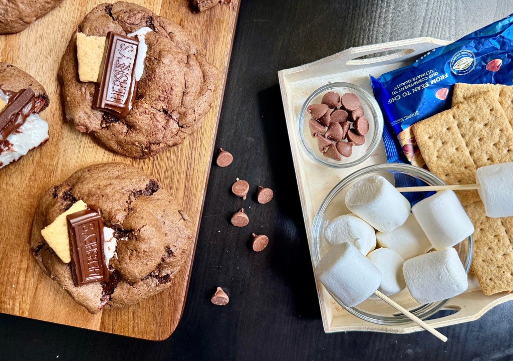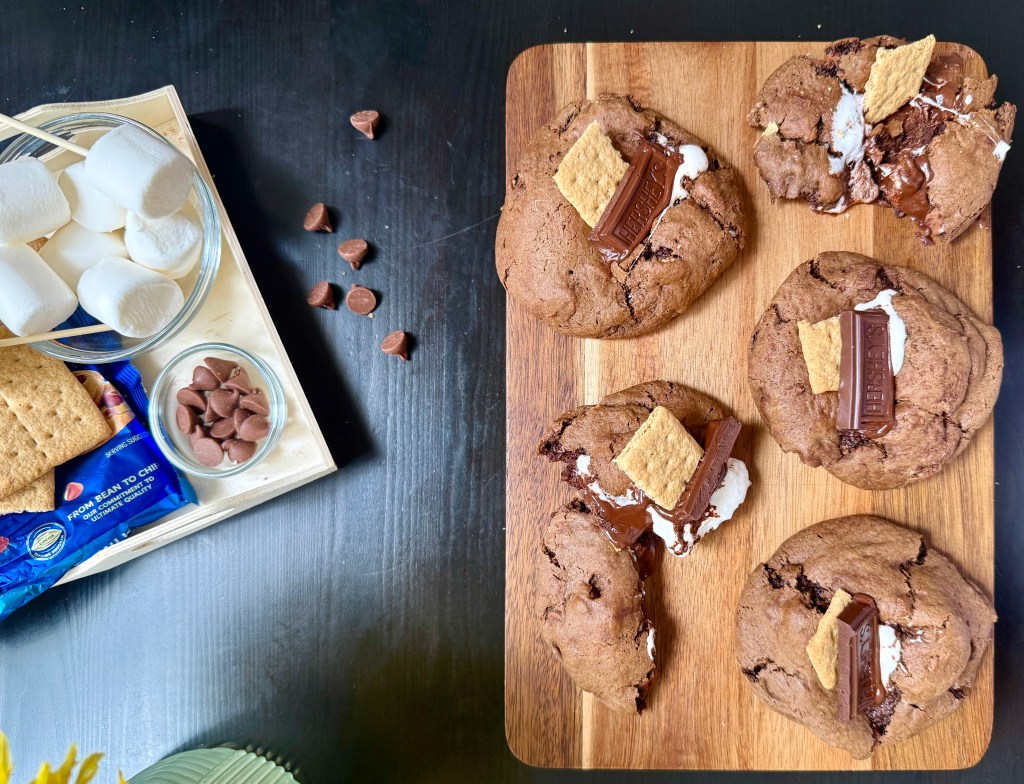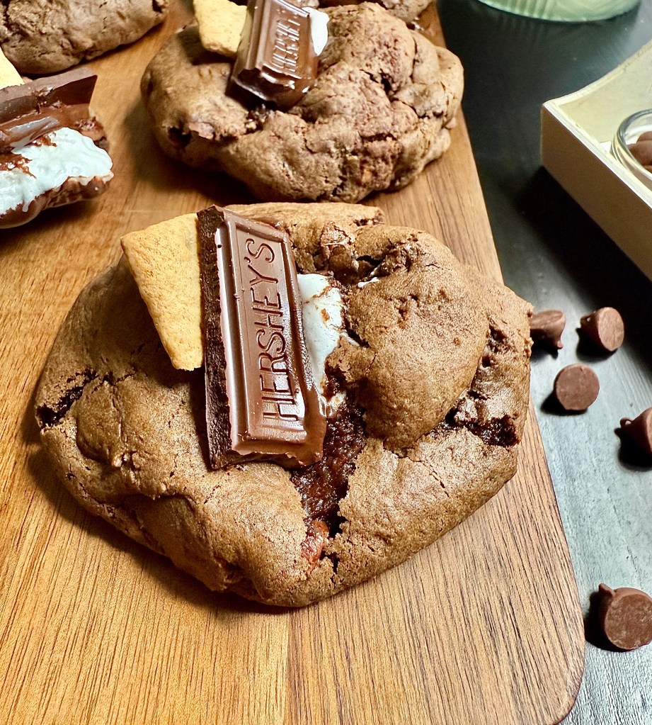 Imagine chewy double chocolate cookie dough, packed with melty chocolate chips and crunchy graham cracker chunks, topped with gooey marshmallows and a hint of golden crisp. Whether you’re reminiscing about summer nights or just want a quick and indulgent bake, these cookies bring all the flavor and fun of s’mores—no campfire needed.