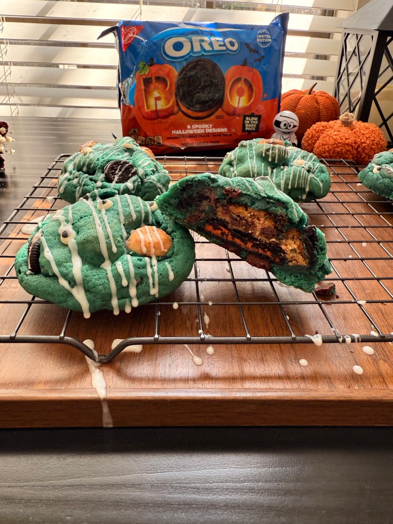 - Shape the Dough – Scoop into 6 large portions (150g each). Flatten, place 1 Oreo + 1 cookie inside, and seal into a ball (about 175g each).